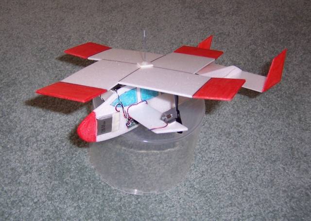The power and control are directly taken from the Silverlit Aero Ace or X-twin plane. The fuselage was made from 9 mm EPP while the wings are made from 3 mm depron. The 2 stabilizer flaps attached on both sides on the lower wing are made with 2mm EPP. The EPP was chosen to withstand knocks and crashes |